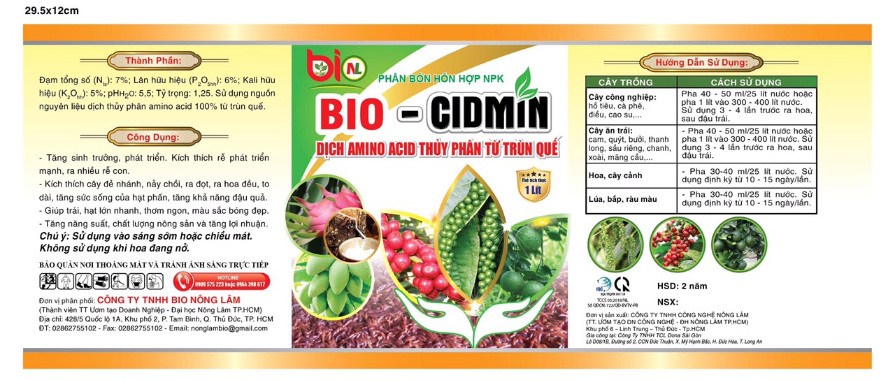 BIO CIDMIN là sản phẩm chứa dịch acid amin thủy phân từ trùng quế chứa đầy đủ các nguyên tố dinh dưỡng đa, trung, vi lượng và humic cung cấp cho cây trồng