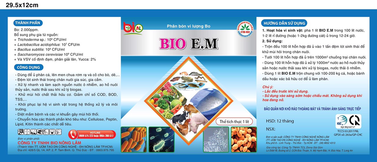 BIO EM là sản phẩm tập hợp nhiều chủng vi sinh có lợi cho cây trồng, có thể dùng để ủ phân bánh dầu, phân cá, phân hữu cơ...