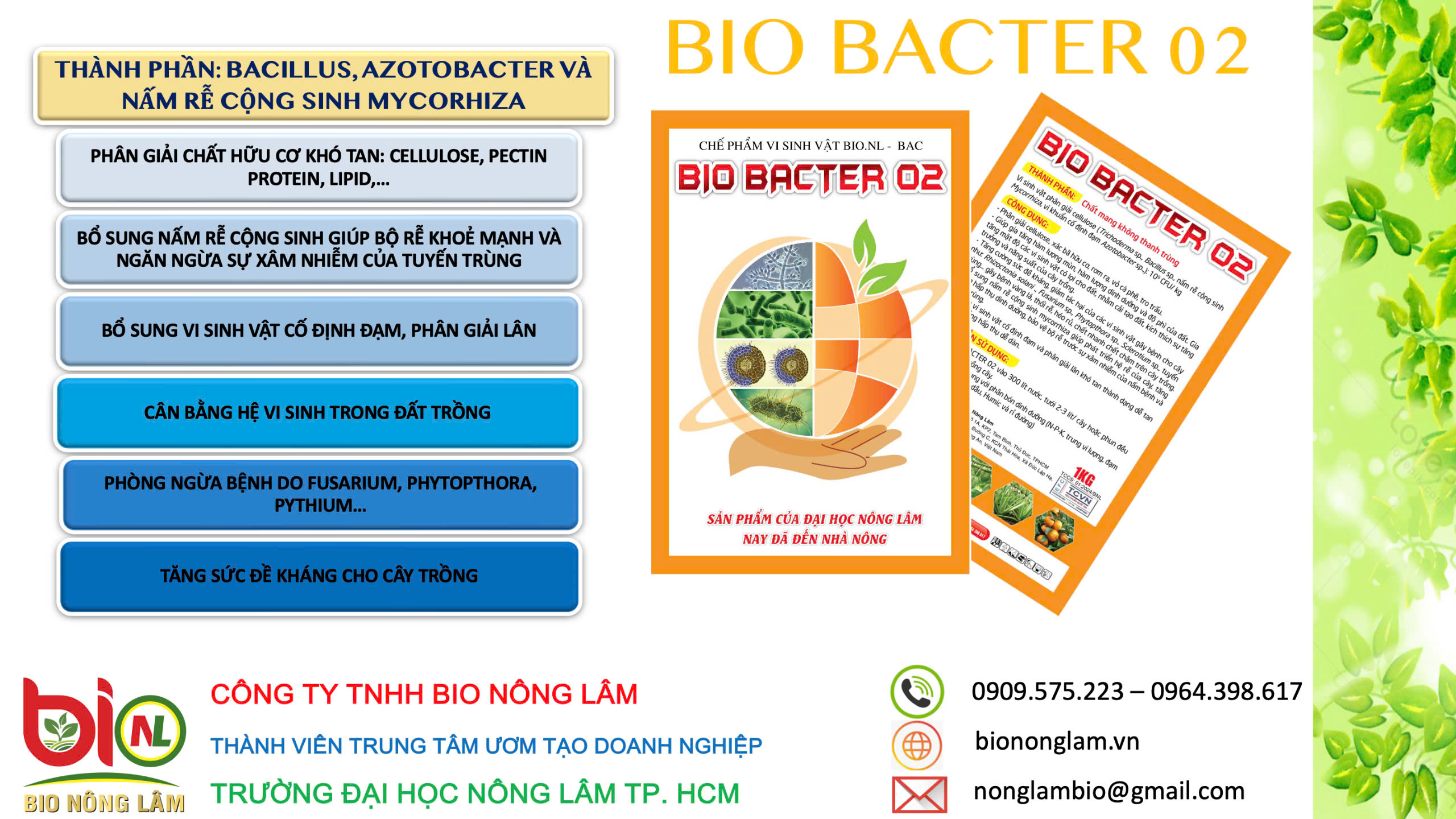 BIO BACTER 02 là sản phẩm gồm các chủng vi khuẩn Bacillus, vi sinh vật cố định đạm, nấm rễ cộng sinh...