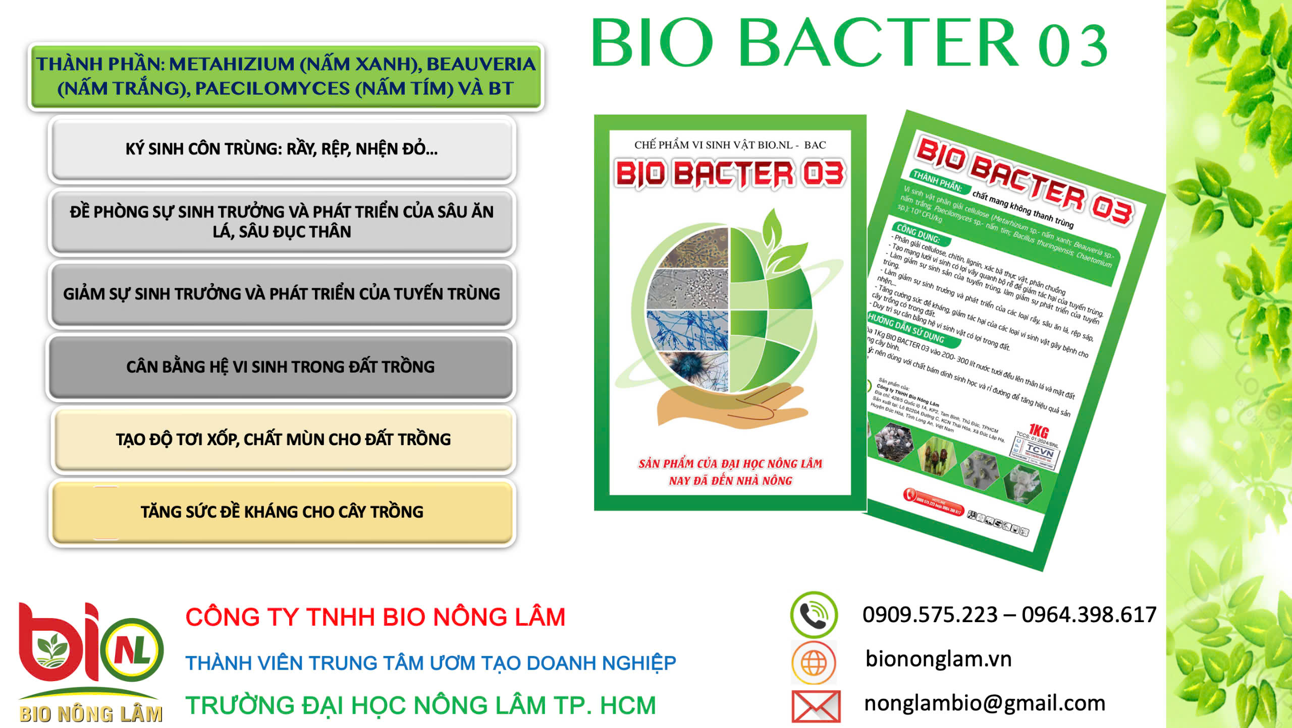Sản phẩm BIO BACTER 03 là tập hợp các loài nấm kí sinh côn trùng như nấm trắng (Beauveria), nấm xanh (Metarhizium), nấm tím (Paecilomyces) và vi khuẩn diệt sâu BT (Bacillus thuringiensis)