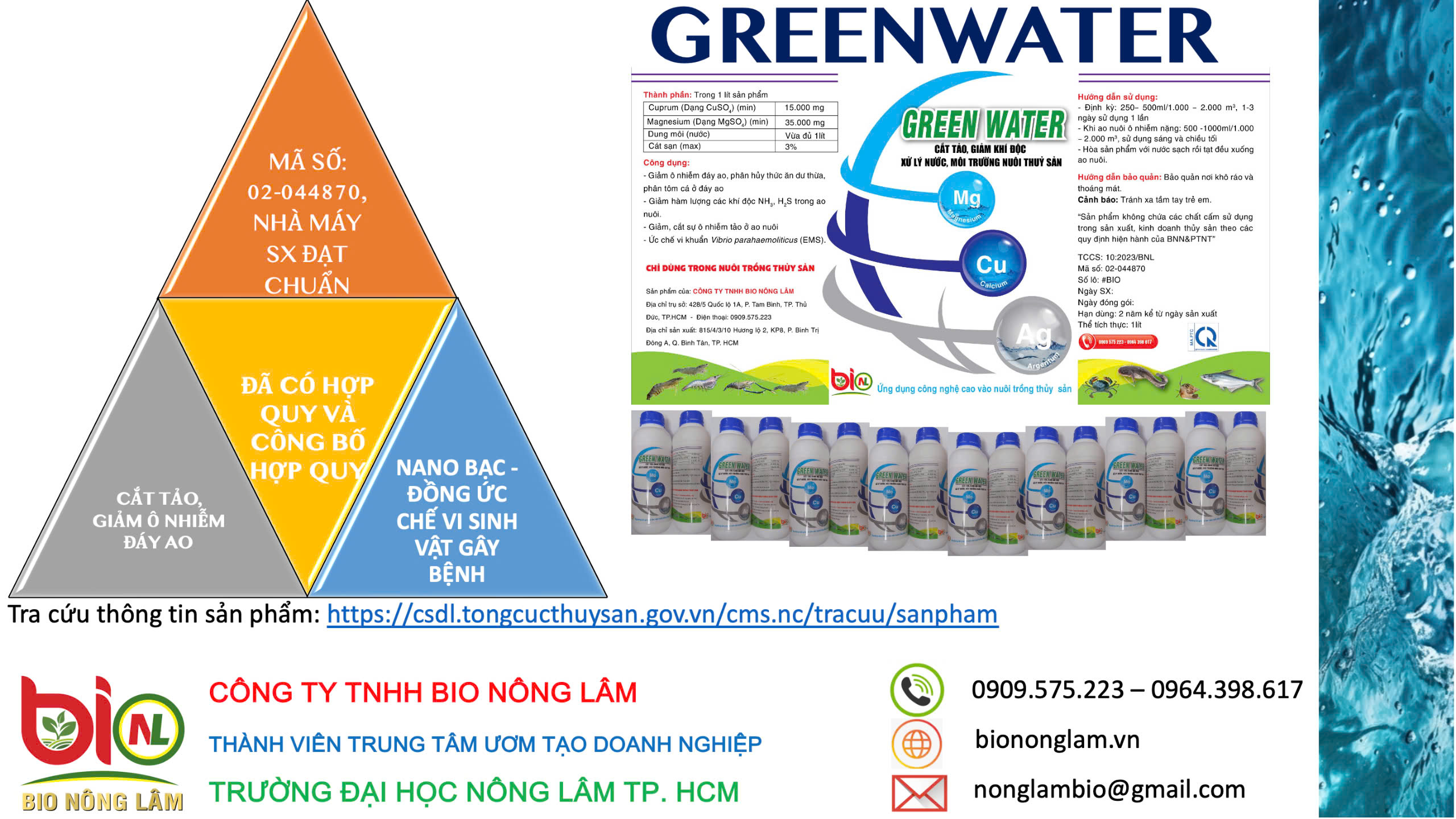 Sản phẩm có thành phần gồm Nano đồng, Nano bạc và Magie giúp xử lý môi trường nước, cắt tảo và hạn chế sự phát triển của các vi sinh vật gây bệnh cho thuỷ sản nuôi trồng